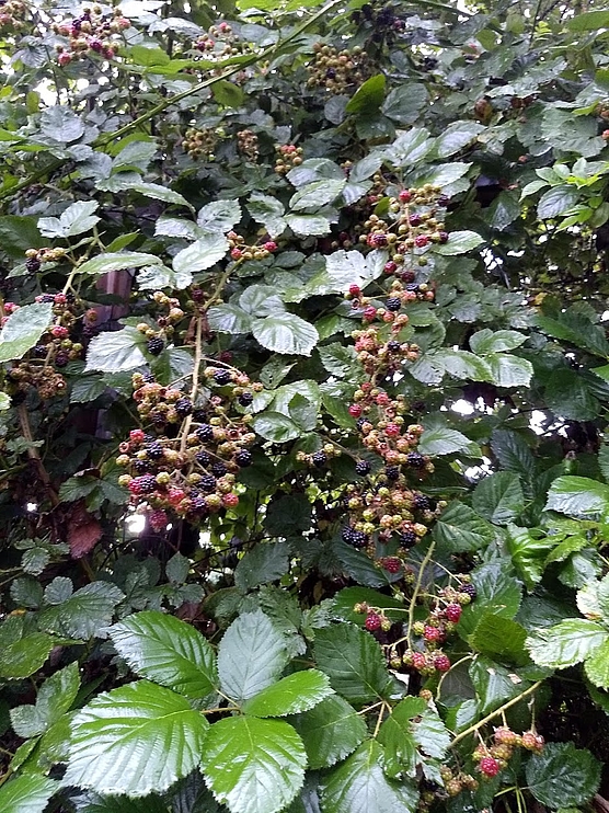 UUnsere Brombeeren sind reif und jeder darf sich bedienen, wenn er mag. Natürlich stachelt es ein wenig, wenn man sich der kleinen Beeren bemächtigt. Aber die Mühe ist es wert. Fruchtig und süß schmecken die Beeren groß und klein.