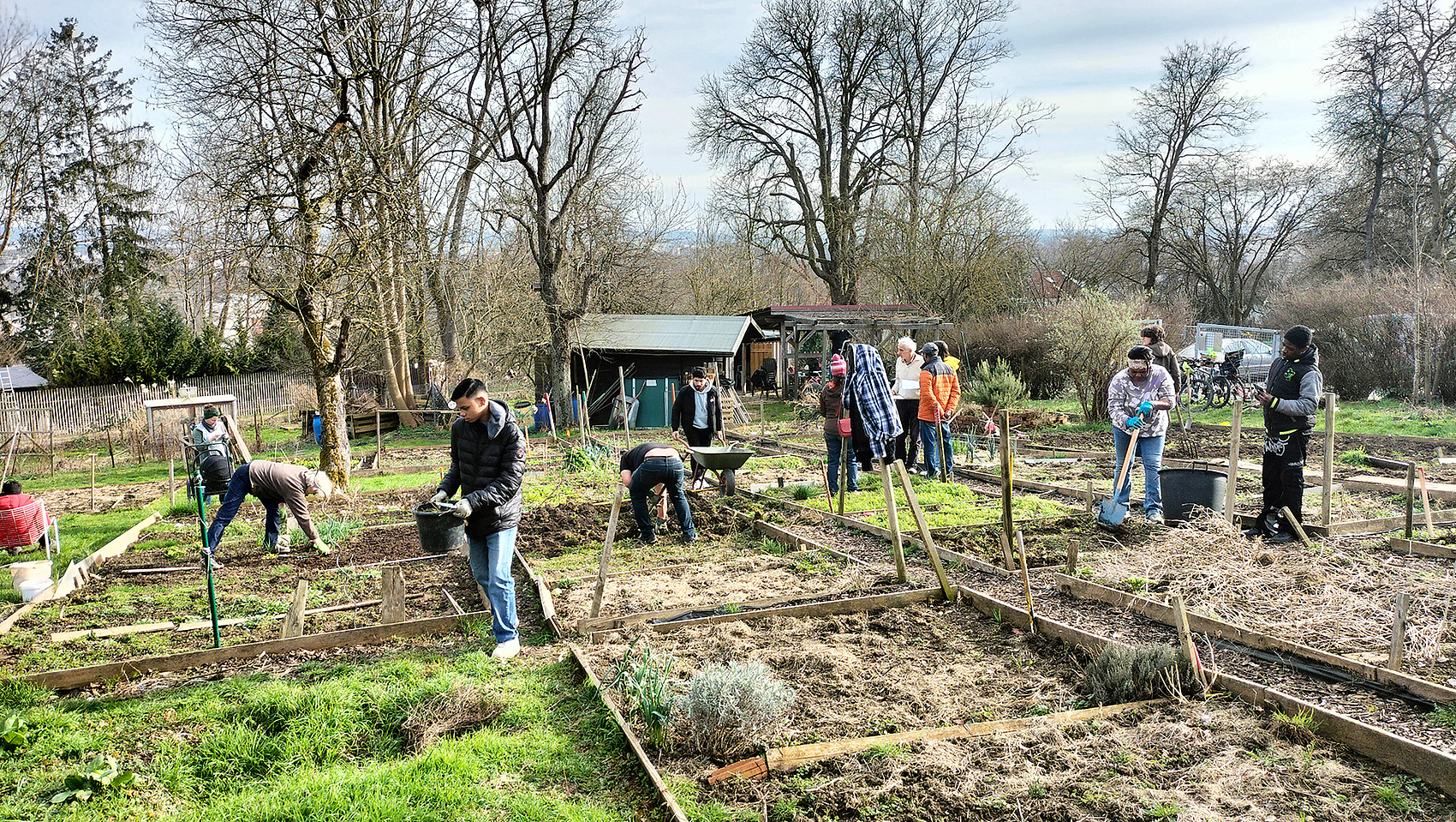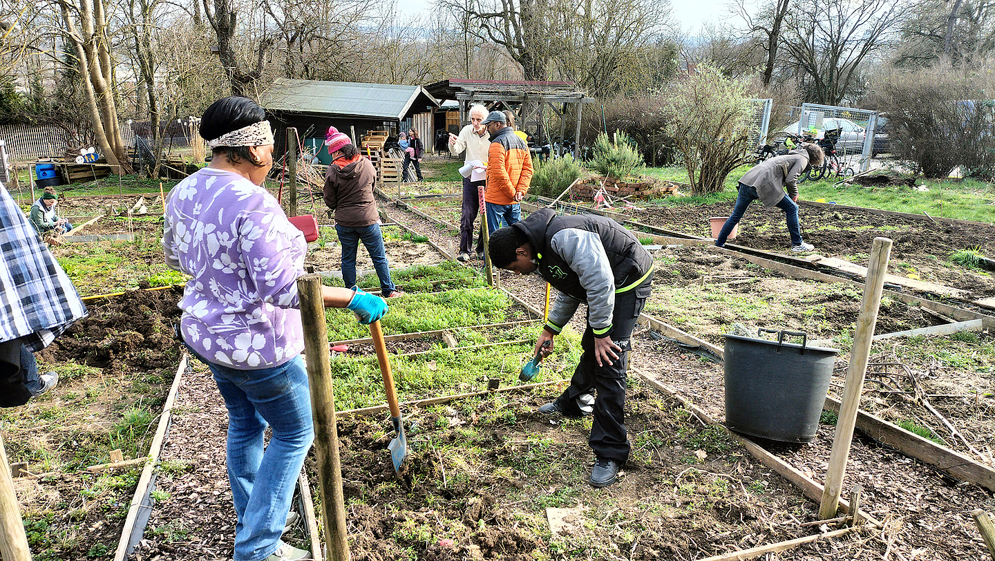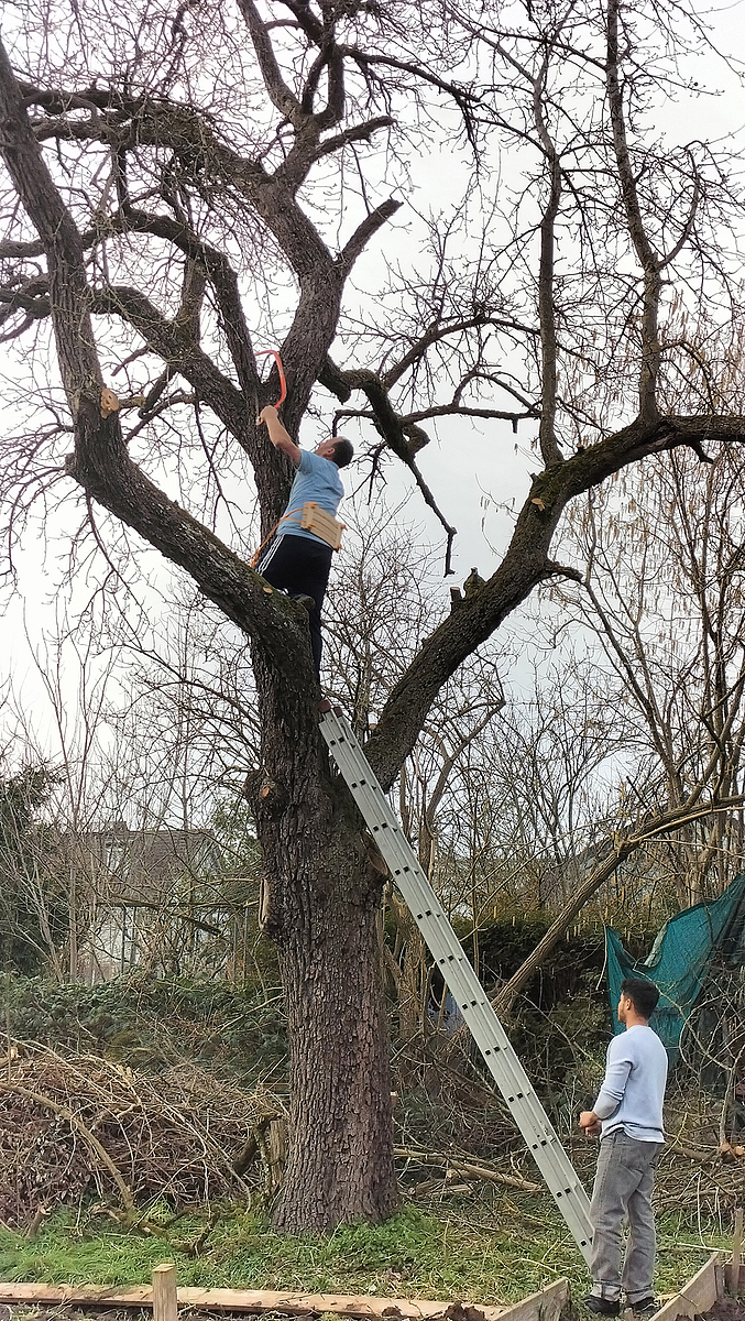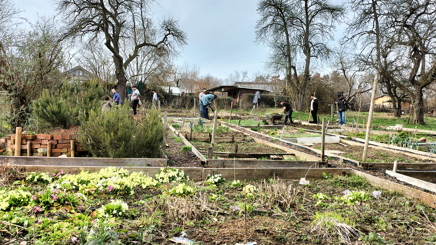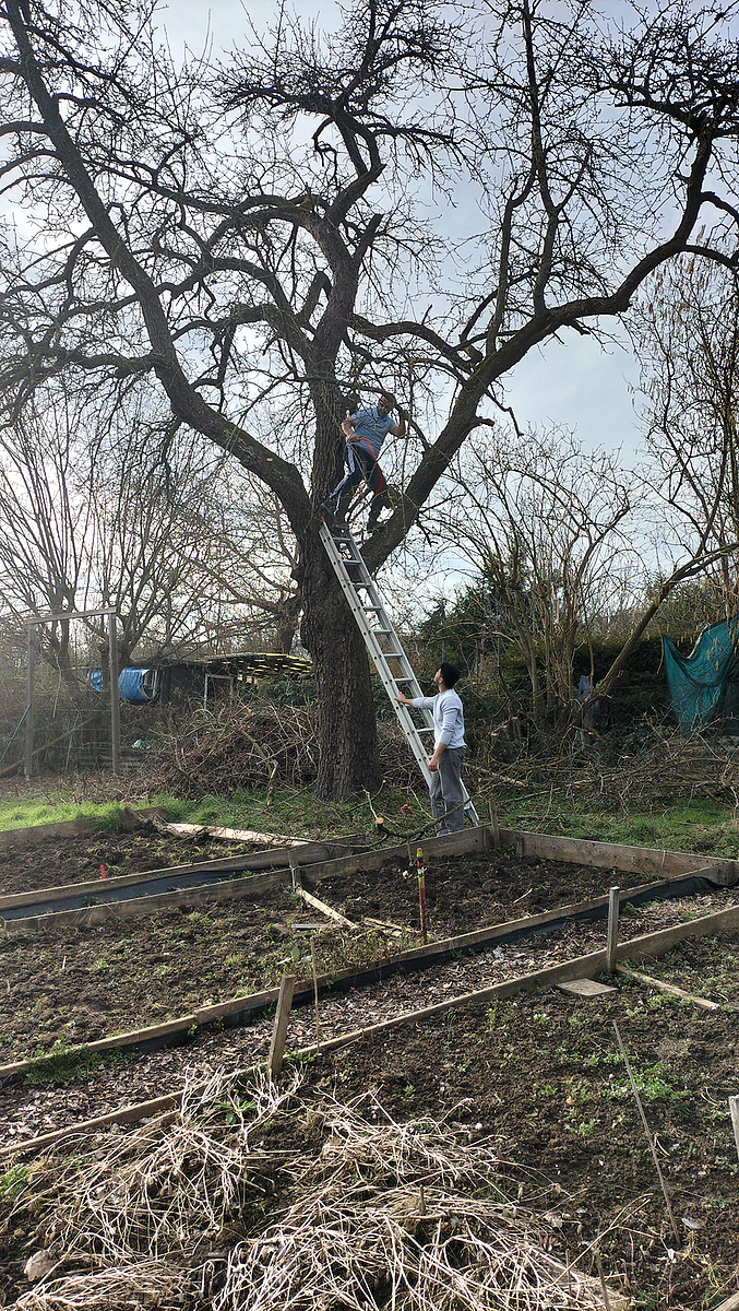 Damit alles gut wächst, sind noch einige Äste hoch im Birnbaum über manchen Beeten abgesägt worden. Sie haben zu sehr die Beete beschattet. Aus den vielen Vogelhäuschen wurden die Nester des letzten Jahres geholt. Zu gleicher Zeit hat die Parzellengruppe in direktem Kontakt mit den Gärtnerinnen und Gärtnern die eigenen Beete verteilt. Mit dem Laptop ging das blitzschnell. Natürlich reichte es noch nach getaner Arbeit zu Kuchen, Kaffee, Tee. Und wir haben uns am Ende gewundert, wie schnell doch viele Leute vieles schaffen können. Jetzt freuen wir uns auf dieses neue Gartenjahr in unserer vielfältigen und bunten Gemeinschaft.
