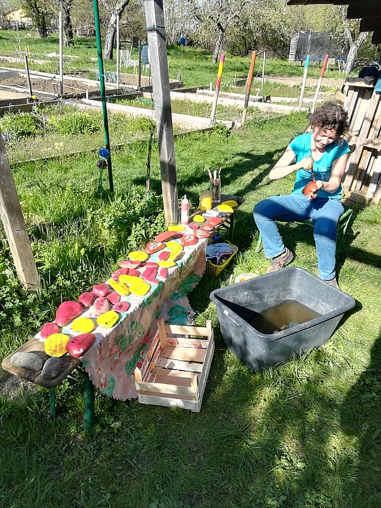 Steine werden markiert. Jetzt wissen alle, wo ihr Beet ist. Und sie kennen das Beet, für die Pflanzen, für die sie Als Paten verantwortlich sind.