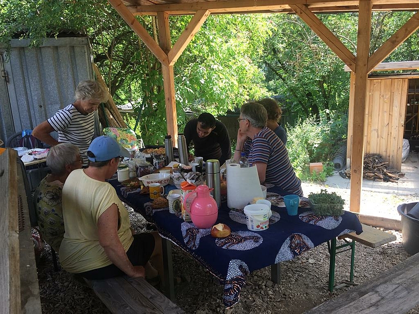 Einmal im Monat treffen wir uns im Garten zu einem gemeinsamen Frühstück im Freien. Jeder bringt mit, was er mag. So haben wir oft den Tisch voll mit kulinarischen Köstlichkeiten aus vielen verschiedenen Ländern. Gemeinsam plaudern wir und genießen die Zeit zusammen.