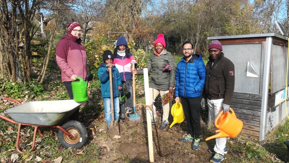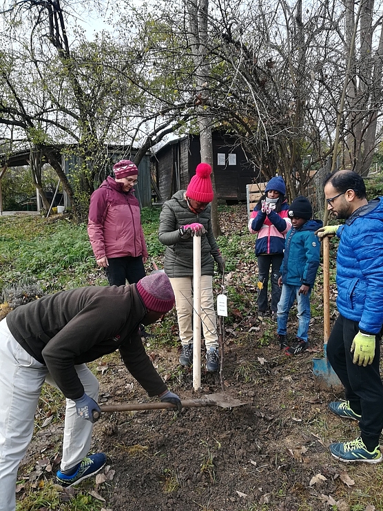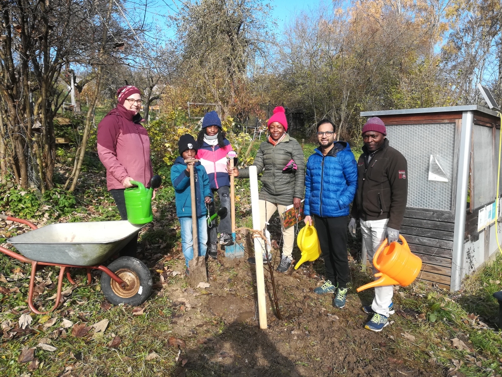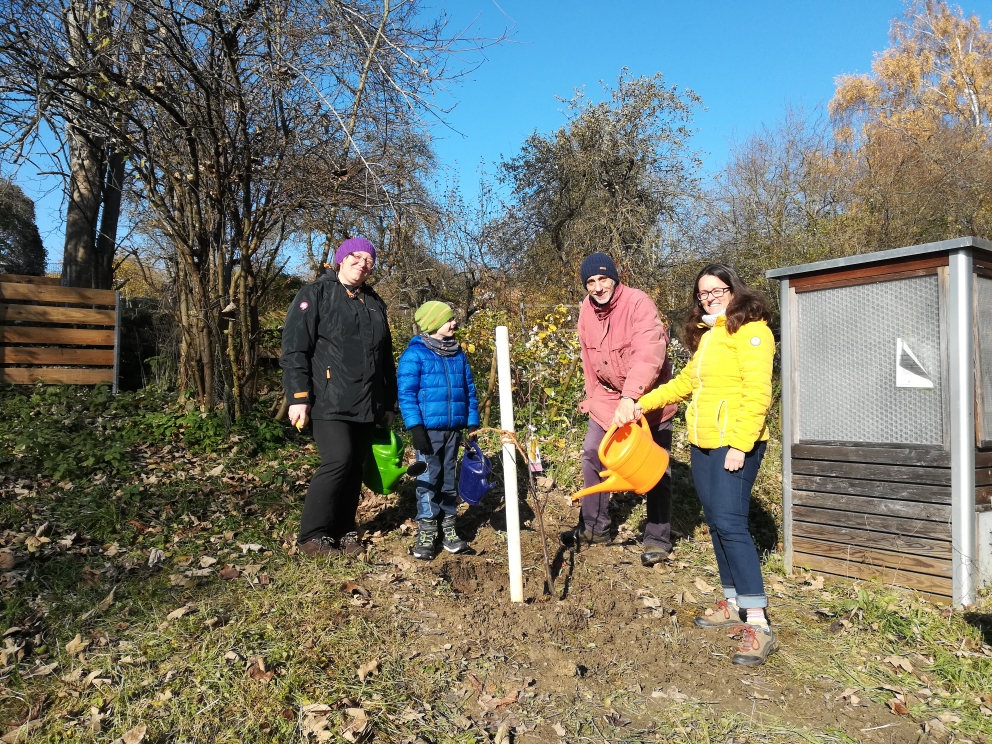 In diesem Jahr haben wir eine Apfelquitte ausgewählt. Eine Birne Helene und eine Hauszwetschge haben wir in den beiden vergangenen Jahren gepflanzt. „Wir pflanzen einen Baum“ – eine Aktion in Ulm. Es wurden insgesamt 350 Bäume an diesem Tag in und um Ulm herum gepflanzt. Damit beteiligten wir uns an der Bewegung, die seit einigen Jahren in Ulm viele Menschen motiviert und begeistert: Es soll grüner und schattiger werden. Es soll feuchter bleiben. Es entstehen so bessere Lebensräume für Tiere und Menschen. „Wenn morgen die Welt unterginge, dann würde ich heute noch ein Apfelbäumchen pflanzen,“ sagte einmal jemand. Die Baumpflanzaktion ist unser kleiner Beitrag zur Klimakonferenz, die zur Zeit in Brasilien stattfindet. Der Blick auf unsere Bäume, ob sie schon bald blühen, wann sie Früchte tragen, wann wir ernten können, und die Frage wie wir sie pflegen,, das alles sind kleine ermutigende Zeichen und alltägliche Perspektiven heute. „Wenn viele kleine Leute an vielen kleinen Orten viele kleine Schritte tun, dann werden sie das Gesicht der Welt verändern.“ Was wir wohl im nächsten Jahr pflanzen werden?