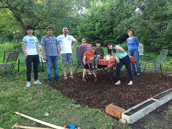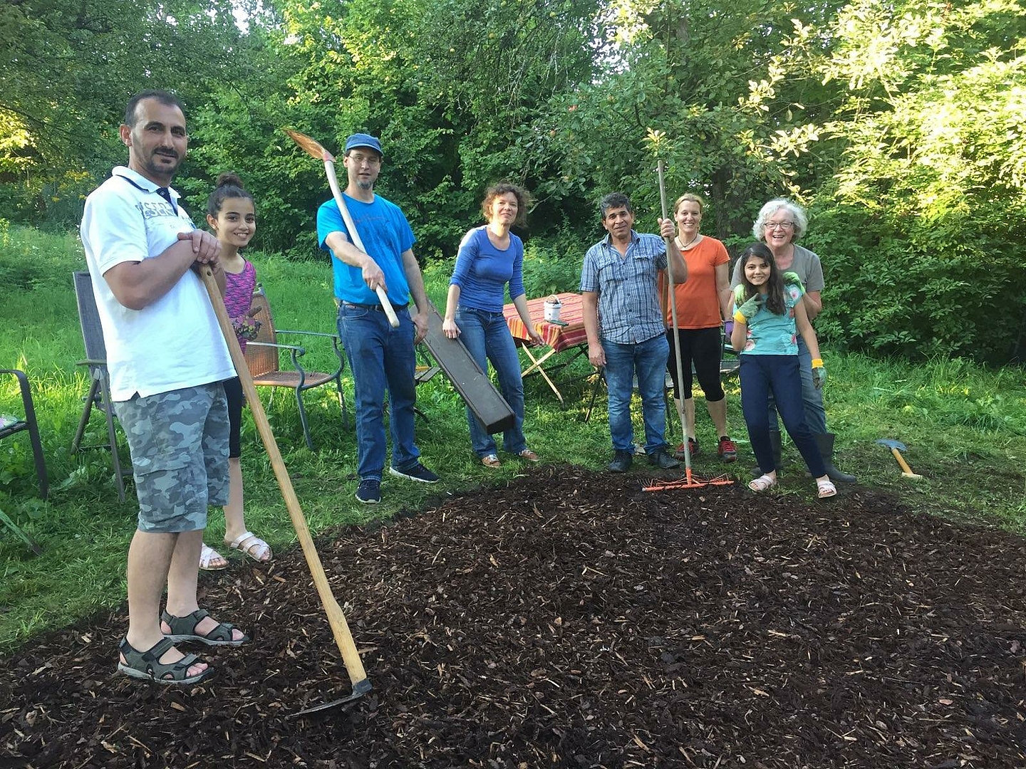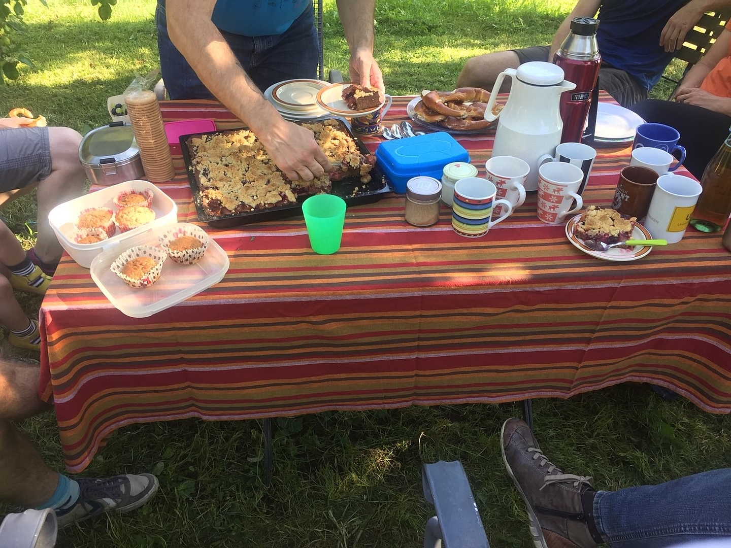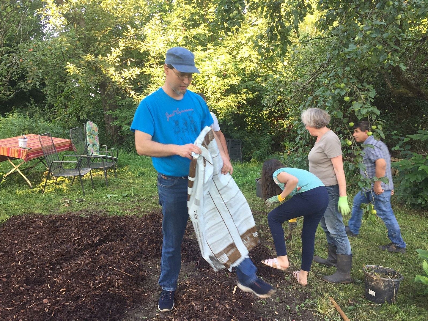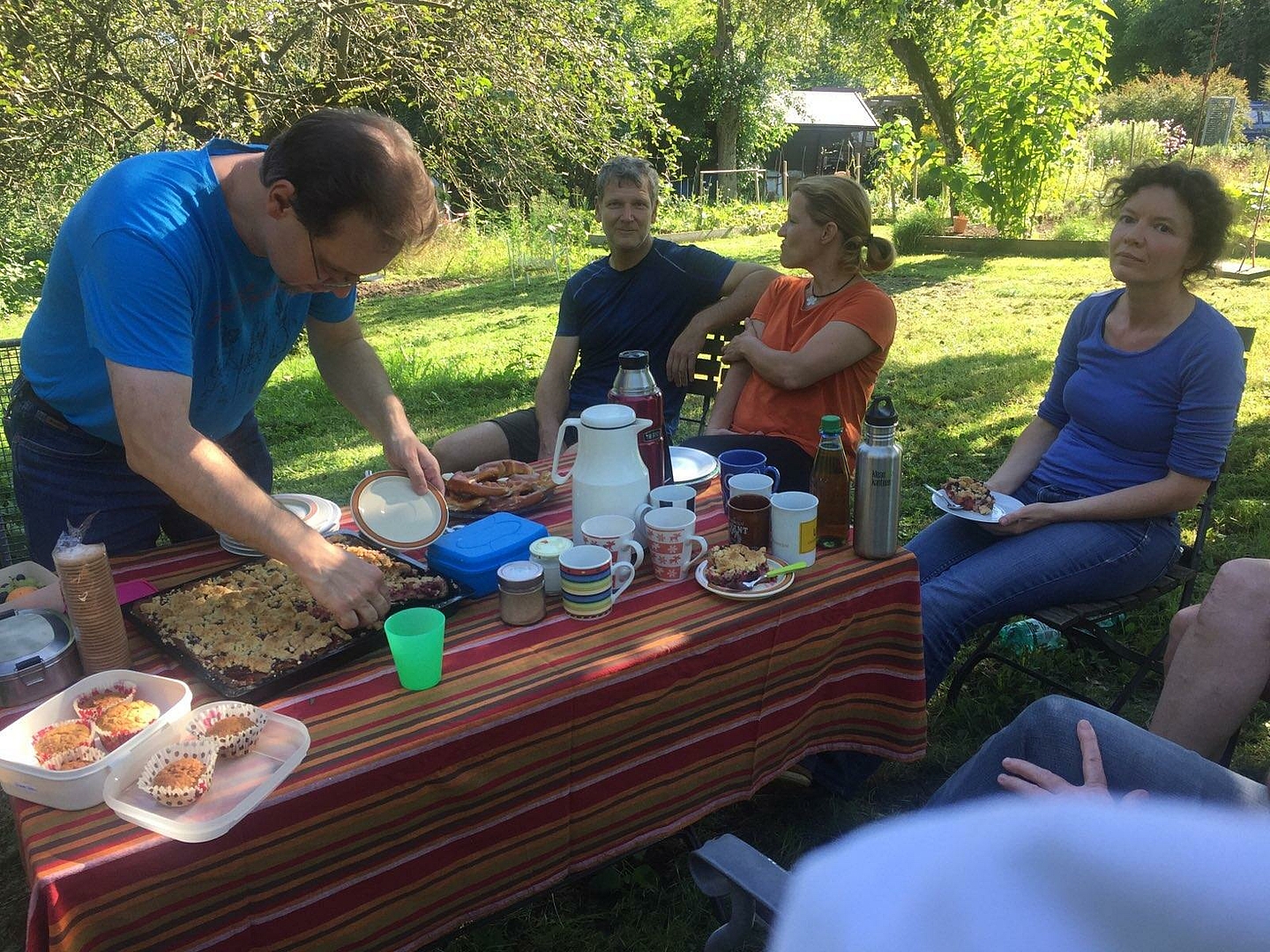 Gestern hatten wir einen sehr schönen Nachmittag. Nach langer Zeit trafen wir uns wieder zu Kaffee und Kuchen im Garten. Unser schöner Sitzplatz im oberen Gartenteil lud dazu ein. Gemeinsam tranken wir Kaffee, plauderten und aßen ein Stück Pflaumenkuchen - so daß wir uns gestärkt und voller Energie in die Gartenarbeit stürzen konnten. Prompt enstand eine richtig schöne neue Sitzecke. Alle packten mit an, huben den Boden aus, begradigten ihn und verteilen Hackschnitzel auf der ebenen Fläche. Der Tisch mit den Stühlen hat nun wieder einen schön ebenen Untergrund und man getrost eine ruhige Minute an diesem lauschigen Plätzchen verbringen. Die Zeit verging wie im Fluge und es ist toll zu sehen, welche Energie und Motivation entsteht, wenn man gemeinsam etwas anpackt.