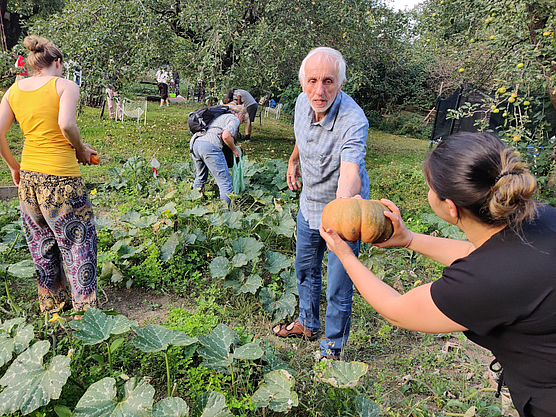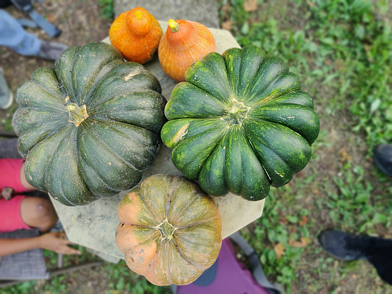 Endlich sind unsere Kürbisse erntereif. Es war eine große Freude gemeinsam zu ernten, die riesigen Kürbisse zu schneiden und sie unter allen unseren Mitgliedern aufzuteilen. Auch die Kinder trafen sich mit großer Begeisterung. Viele probierten später verschiedene Rezepte mit den leckeren Kürbissen aus. Was kann man von der Mutter Erde mehr verlangen?