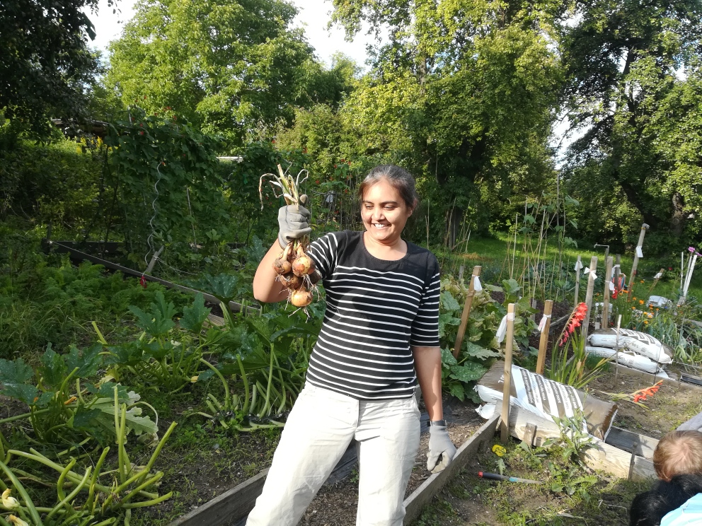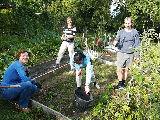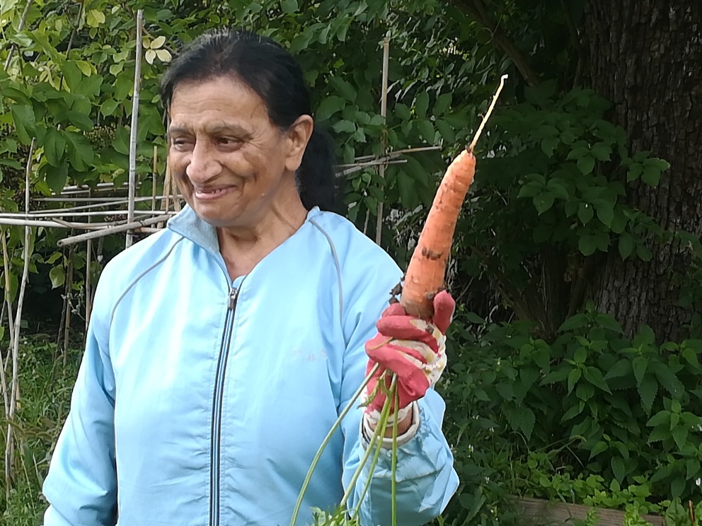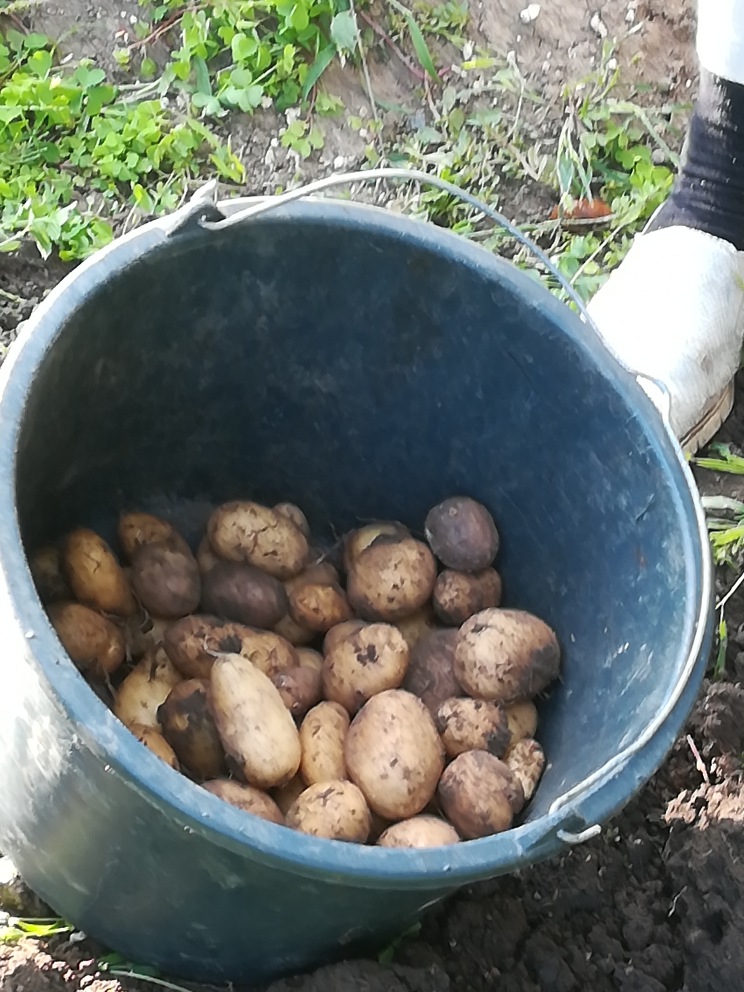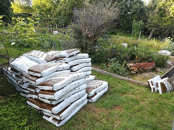 Heute haben wir viel geschafft. Alle Säcke des Rindenmulches schafften wir vom Anlieferort bis in den Garten und konnten sogar schon mit dem Verteilen des Mulches auf den Wegen beginnen. Wir waren ein gutes Team! Zwiebeln, Kartoffeln, Bohnen und Karotten begannen wir zu ernten. Die Natur gibt uns so reichlich!